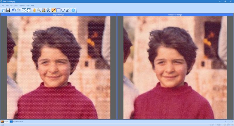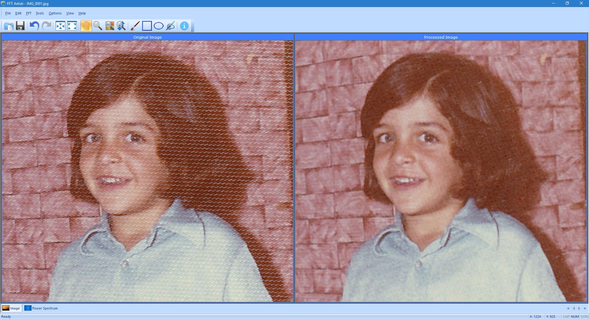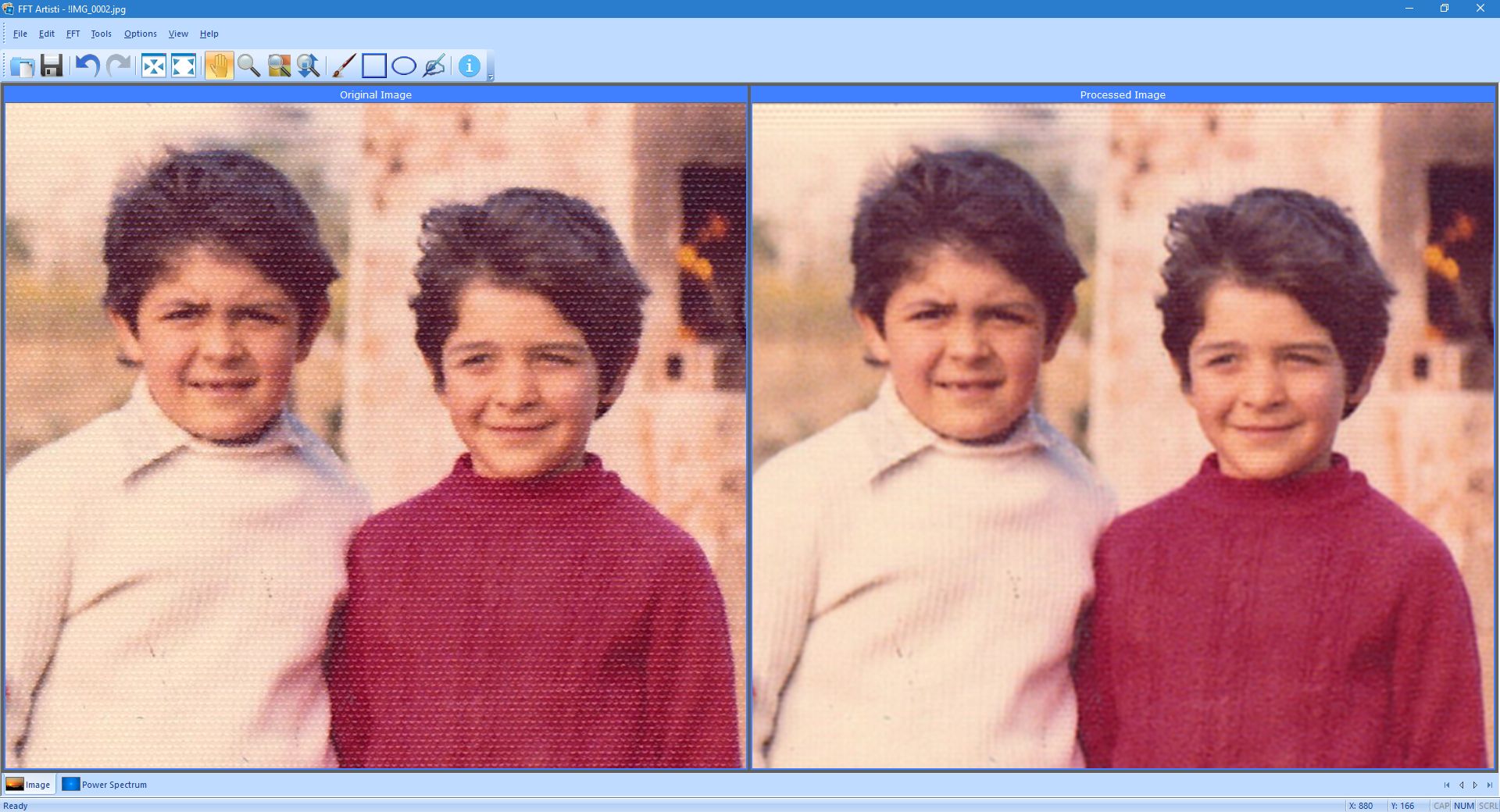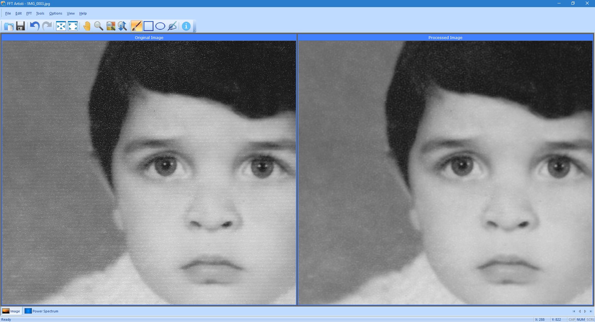 FFT Artisti is a program that removes pattern noise from images (jpg, tif, png and bmp).The program uses the Fast Fourier Transform (FFT), convolution low-pass filters in frequency domain or/and direct frequency deleting to eliminate the pattern noise.